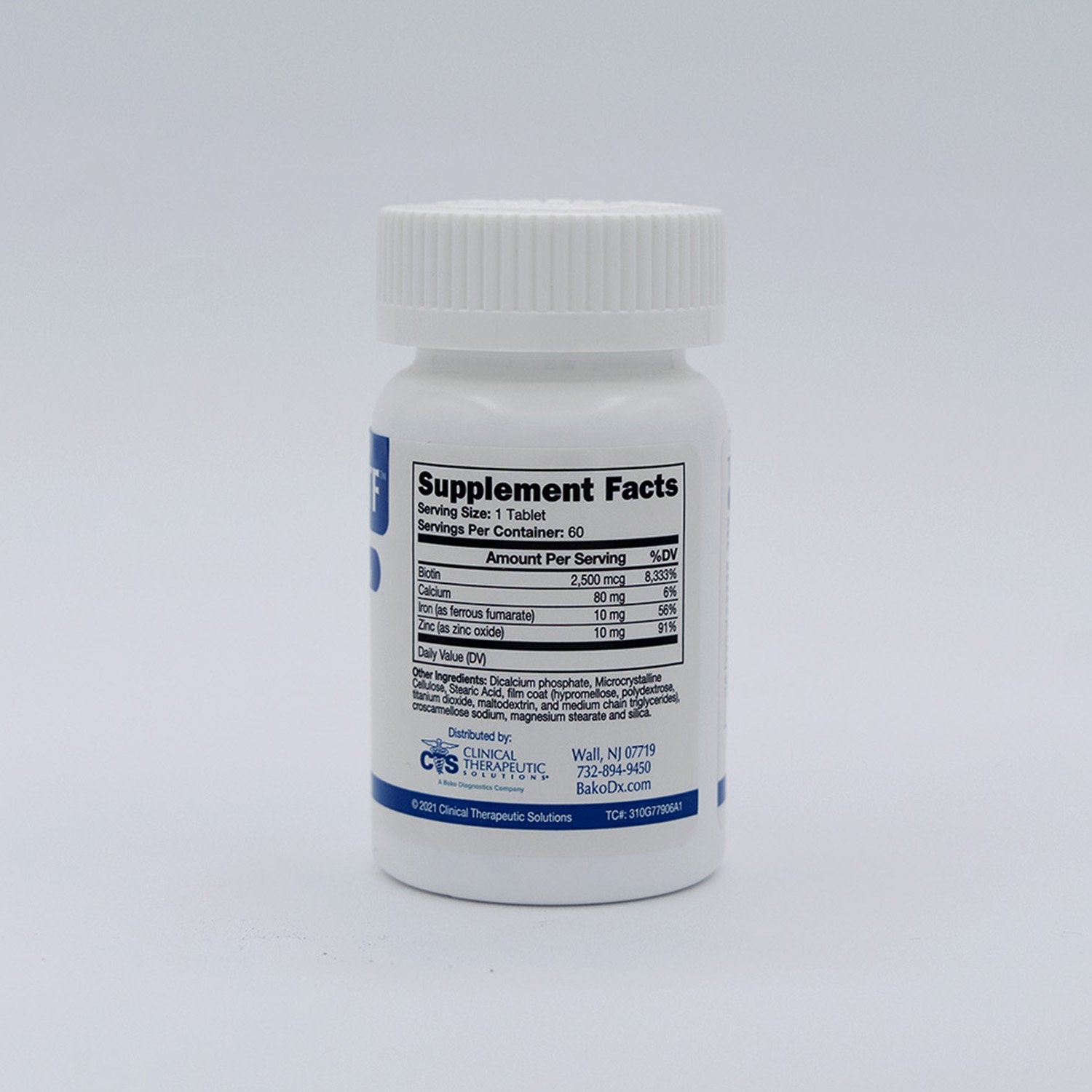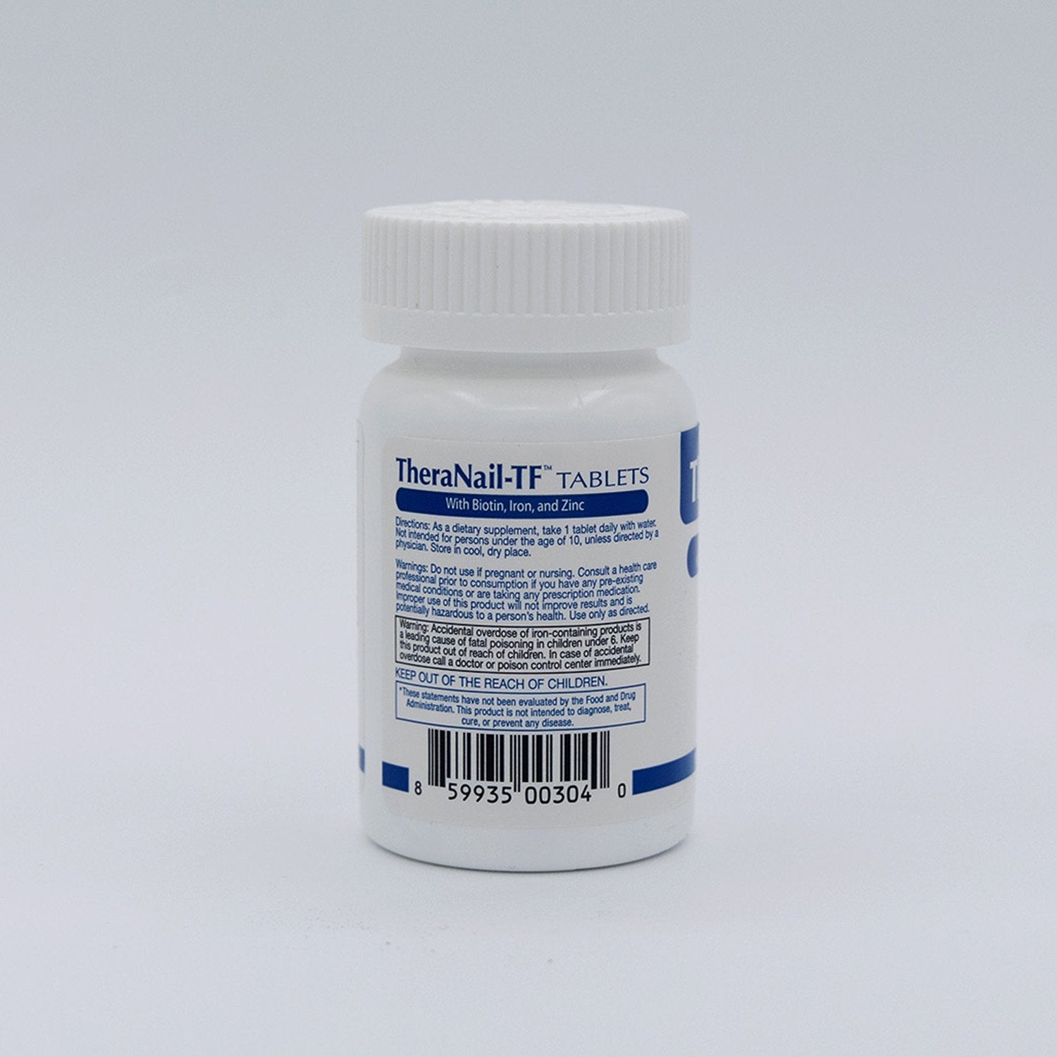 TheraNail-TF is a proprietary formulation containing biotin (2.5 mg), iron (10 mg), and zinc (10 mg) available for oral administration as a small, once-daily, easy-to-swallow tablet.